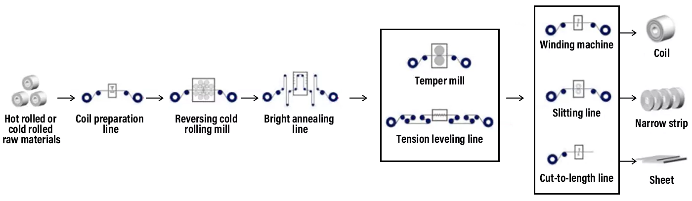 In this process flow, the hot-rolled stainless steel raw materials are rolled by the cold rolling mill for multiple passes to reach the target thickness, and then the pickling and annealing process is carried out to achieve the required mechanical properties and surface effects; finally, the temper process is carried out to optimize the surface quality of the stainless steel sheet and strip. The wide width cold-rolled stainless steel sheet and strip produced through this process flow has a 2B surface and belongs to the soft cold-rolled stainless steel sheet and strip in terms of mechanical properties.
